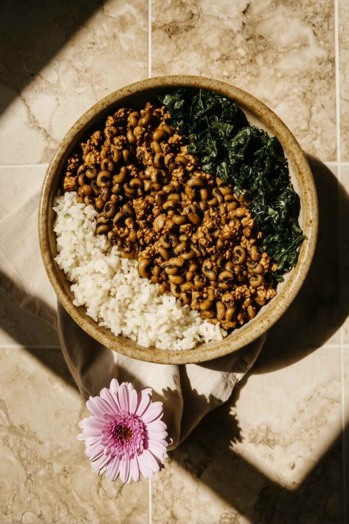 We built our bowls with rice at the bottom, Black-Eyed Peas on top, turkey on the side, and kale for balance. The kids loved it, and I felt so good about serving a meal that was hearty, nourishing, and filled with flavor.
